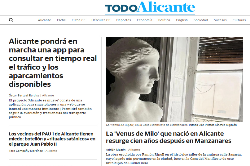 La copia de la Venus de Milo esculpida por el escultor alicantino Ramón Ripoll, a principios del siglo XX, ha resurgido 100 años después en la Casa del Manifiesto de Manzanares (Ciudad Real). La obra ha sido adquirida por el colectivo Patrimonio Manzanares y se ha presentado en sociedad durante el acto inaugural de la exposición ‘Luces del pasado’, de la pintora María Ángeles Puche. De este modo, se vuelve a despertar un renovado interés por el legado artístico de la familia Ripoll, una de las sagas escultóricas más importantes de Alicante y España.